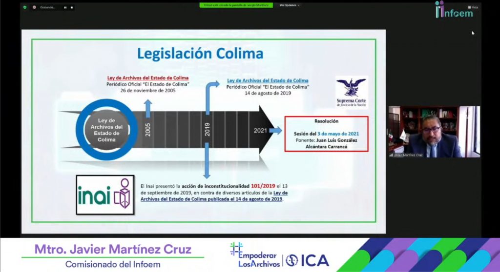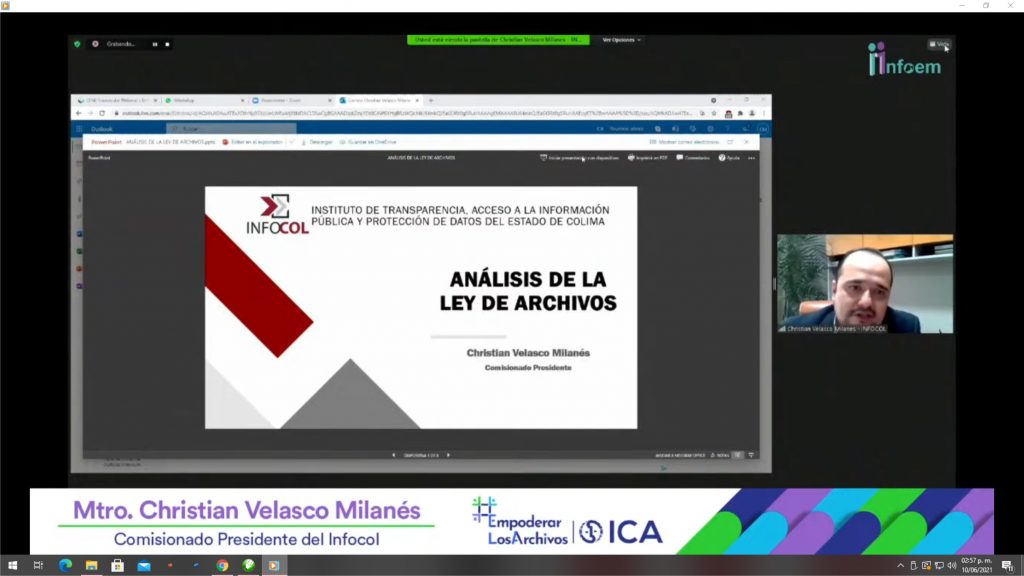 El comisionado presidente del Instituto de Transparencia, Acceso a la Información Pública y Protección de Datos del Estado de Colima (Infocol), Christian Velasco Milanés participó como ponente en el evento, “Empoderando las rutas locales para implementar la Ley General de Archivos: Las decisiones de la Suprema Corte de la Nación (SCJN) en los casos de la legislación de Colima y Jalisco”, evento organizado por el Instituto de Transparencia, Acceso a la Información Pública y Protección de Datos Personales del Estado de México y Municipios (Infoem).
