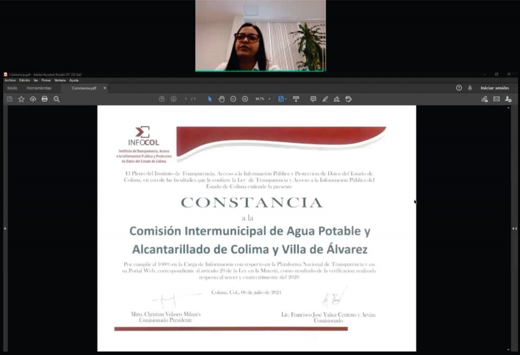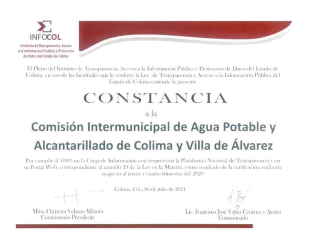 Con base a al potestad que tiene el Infocol de verificar el cumplimiento de información obligatoria de los sujetos obligados, y en acuerdo de pleno del órgano garante colimense entregó a la Comisión Intermunicipal de Agua Potable y Alcantarillado de Colima y Villa de Álvarez (CIAPACOV), la constancia por cumplir al 100% con la Carga de Información en la Plataforma Nacional de Transparencia y en su Portal Web, correspondiente al artículo 29 de la Ley en la materia, como resultado de la verificación realizada respecto el tercer y cuarto trimestre del 2020.