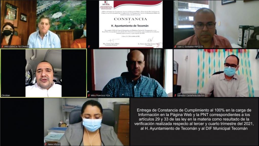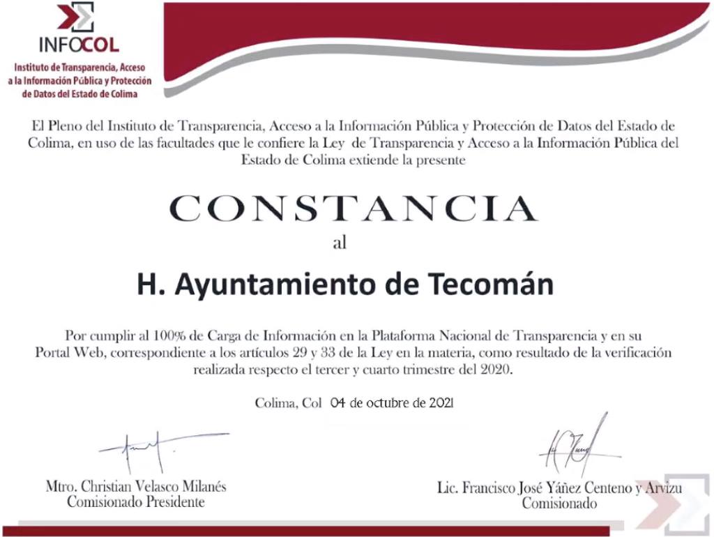 Se hizo entrega de la constancia de cumplimiento al 100% por la carga de información en la Plataforma Nacional de Transparencia y su portal web al H. Ayuntamiento de Tecomán y DIF Municipal Tecomán, correspondiente a los artículos 29 y 33 de la ley de la materia como resultado de la verificación realizada respecto al tercer y cuarto trimestre del 2020.