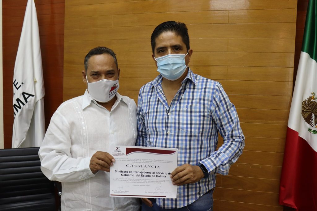Entrega el Instituto de Transparencia, Acceso a la Información Pública y Protección de Datos del Estado de Colima (Infocol), la constancia de cumplimento al sujeto obligado, Sindicato de Trabajadores al Servicio del Gobierno del Estado de Colima, esta, por cumplir al 100 por ciento con la carga de Información en la Plataforma Nacional de Transparencia y en su portal web durante el primer semestre del 2021 correspondientes a los artículos 29, 40 y 42 de la ley en la materia.