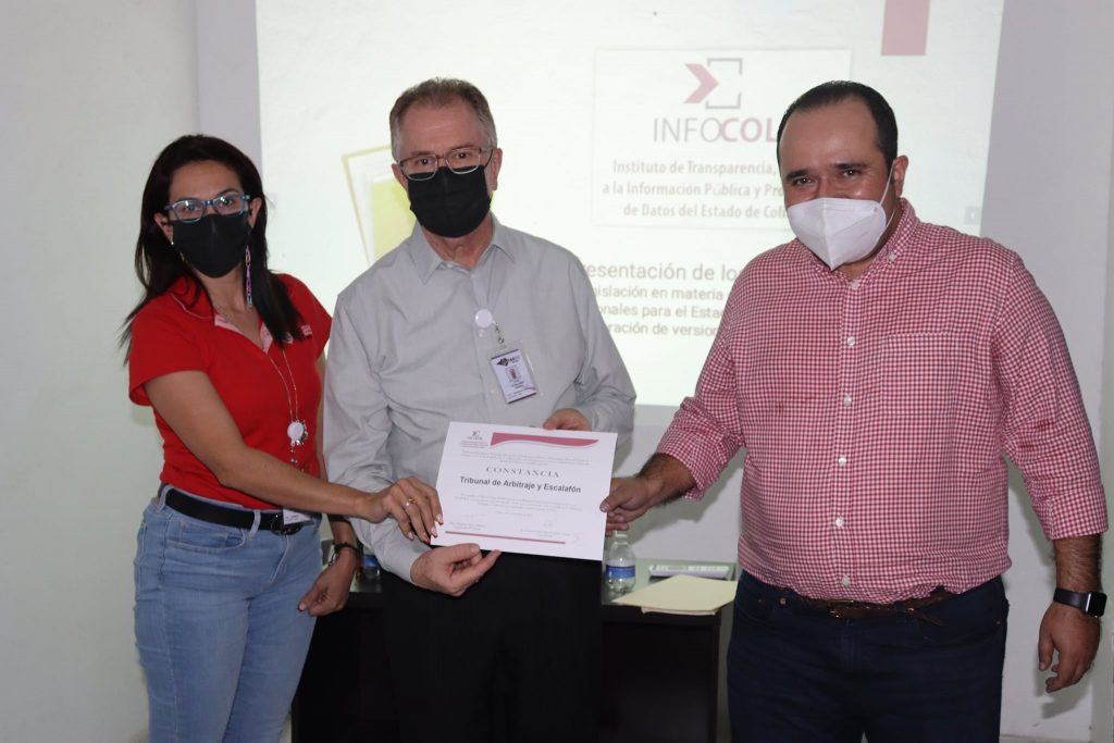 Entrega el Instituto de Transparencia, Acceso a la Información Pública y Protección de Datos del Estado de Colima (Infocol), la constancia de cumplimento al sujeto obligado, Tribunal de Arbitraje y Escalfón esta, por cumplir al 100 por ciento con la carga de Información en la Plataforma Nacional de Transparencia y en su portal web durante el primer semestre del 2021 correspondientes a los artículos 29 y 40 de la ley en la materia.